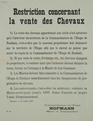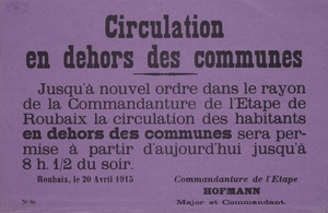 Wandanschlag in französischer Sprache. Veröffentlicht im von Deutschland besetzten Frankreich; Roubaix, 19. Juli 1915. Verbot des Baumfällens entlang des Kanals. "Défense d’abattre des arbres le long du canal. Il est défendu, sauf autorisation spécial, d’abattre des arbres ou de couper leurs branches le long du canal (sur le territoire de la Commandanture de l’Etape de Roubaix). Les Maires des communes en question sont rendus responsables des infractions à cet ordre et seront punis. Roubaix, le 19 Juillet 1915. Commandanture de l’Etape Hofmann Major et Commandant."