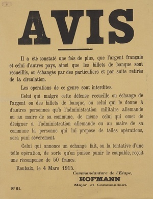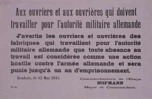 Wandanschlag in französischer Sprache. Veröffentlicht im von Deutschland besetzten Frankreich; Roubaix, 18. Juni 1915. Unter der Androhung, nach Deutschland verschleppt und interniert zu werden, wird sämtliche Arbeitssabotage in den Fabriken unter deutscher Verwaltung verboten. "Désordres dans les usines dirigées par l’administration militaire allemande Ces derniers jours des désordres se sont renouvelés dans les usines travaillant sous la direction de l’administration militaire allemande par suite de la résistance des patrons, des directeurs, des employés ou des ouvriers. En conséquence je déclare ce qui suit: 1). Les patrons, les directeurs, les employés, les ouvriers ainsi que les ouvrières ne travaillent pas volontairement mais sur l’ordre de l’administration militaire allemande. 2). Tout désordre dans le fonctionnement de la fabrique dû à une cessation du travail préméditée par les patrons, les directeurs, les employés, les ouvriers ou les ouvrières sera considéré comme une action hostile contre l’armée allemande et punie comme telle suivant les lois militaires. Toute excitation au désordre sera traitée de la même facon. 3). Toutes les personnes qui se rendent coupables de telles actions ou celles qui en sont les instigatrices doivent s’attendre à être transportées en Allemagne. Roubaix, le 18 Juin 1915. Commandanture de l’Etape Hofmann Major et Commandant."