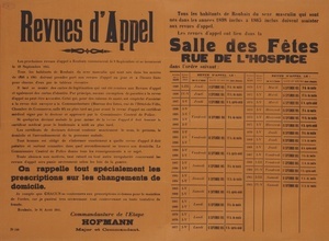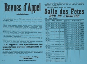 Wandanschlag in französischer Sprache. Veröffentlicht im von Deutschland besetzten Frankreich; Roubaix, 30. Juni 1915. Unter Androhung von Strafe, werden alle Männer, die zwischen 1898 und 1865 geboren sind, zur Meldung einberufen. "Revues d’Appel Les prochaines revues d’appel à Roubaix commencent le 6 Juillet et se terminent le 15 Juillet 1915. Tous les habitants de Roubaix du sexe masculin qui sont nés dans les années 1898 à 1865 doivent prendre part aux revues d’appel au jour et à l’heure fixée pour chacun d’eux par le tableau ci-contre. Il faut se munir de papiers militaires ou d’autres certificats, si possible avec photographie. Par principe, aucune exemption de paraître à la revue d’appel ne peut être accordée. Celui qui, pour des raisons de santé, est empêché d’assister à la revue doit envoyer à la Commandanture (Bureau des listes, rue de l’Hôtel-de-Ville, Chambre de Commerce, salle 27) au plus tard un jour avant la revue d’appel un certificat médical signé par le docteur et approuvé par le Commissaire Central de Police. Si quelqu’un devient malade le jour même de la revue d’appel il doit fournir le certificat médical pour le lendemain à midi au plus tard. Les certificats de docteurs doivent contenir exactement le nom, le prénom, le domicile et l’arrondissement de la personne malade. Tout homme est obligé de s’informer exactement à quel revue d’appel il doit paraître et surtout connaître dans quel arrondissement se trouve son domicile. Le Commissaire Central de Police donne tous les renseignements à ce sujet. Toute absence non motivée, tout retard ou tout autre irrégularité concernant les revues d’appel sera punie sévèrement selon les lois de la guerre. On rappelle tout spécialement les prescriptions sur les changements de domicile. Je compte que CHACUN se conformera aux préscriptions ci-dessus pour le maintien de l’ordre, car je punirai très sévèrement tout contrevenant ou toute tentative de fraude. Roubaix le 30 Juni 1915. Commandanture de l’Etape Hofmann Major et Commandant. [gegenüber] Tous les habitants de Roubaix du sexe masculin qui sont nés dans les années 1898 inclus à 1865 inclus doivent assister aux revues d’appel. Les revues d’appel ont lieu dans la Salle des Fêtes Rue de l’hospice dans l’orde suivant: [Liste mit Jahreszahlen und jeweils zugeordneten Terminen]"