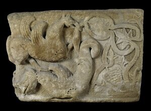 Unter Erzbischof Ruthard von Mainz wurde 1108 auf dem Disibodenberg in der nördlichen Pfalz der Grundstein zu einer großen Abteikirche der Benediktiner gelegt. Die berühmte Hildegard von Bingen verbrachte fast vierzig Jahre (1112-1148) in der Frauenklause des Klosters. Aus jener Glanzzeit des Klosters stammt diese als „Keltertrog“ überlieferte Spolie. Das Historische Museum der Pfalz erwarb das Exponat Anfang des 20. Jahrhunderts vom Weingut Grossarth in Odernheim am Glan, dort war es bis zuletzt als Keltertrog in Gebrauch. Die Herkunft aus dem ehemaligen Benediktinerkloster Disibodenberg, dessen Ruinen Ende des 18. Jahrhunderts zum Abbruch freigegeben wurden, gilt als gesichert. Auch wenn das Exponat in Letztverwendung als Keltertrog überliefert ist, darf eine ebensolche Erstverwendung als wenig wahrscheinlich angenommen werden. Es ist aber nach wie vor nicht völlig auszuschließen, dass der Disibodenberger Keltertrog zu einer großen Baumkelter gehörte. Die aufwändige bildhauerische Bearbeitung mag man mit der besonderen christlich-mittelalterlichen Wertschätzung des Weines erklären, die z. B. auch in der mystischen Gleichsetzung Christi mit der Kelter zum Ausdruck kommt. Allerdings fehlen entsprechend skulptierte Vergleichsstücke, die sonst überlieferten Keltertröge sind allesamt schmucklos. Wahrscheinlicher ist, dass es sich beim Keltertrog ursprünglich um ein Architekturteil in der Art eines Kämpfers handelte. Die Spolie besitzt drei Schauseiten, die Rückseite ist geglättet. Über die drei Schauseiten zieht sich ein mittelalterliches Bestiarium von Tier- und Fabelgestalten, die allesamt dem damals geläufigen "Physiologus" entstammen dürften: Ein Adler schlägt einen Hasen, geflügelte Greife halten zwei Drachenwesen fest. Auf der rechten Schmalseite schließlich ist ein Weinrankenrelief mit einer großen Weintraube zu sehen. Die bildhauerische Arbeit legt einen Zusammenhang mit der u.a. am Mainzer Dom zeitgleich tätigen Gruppe norditalienischer Steinmetze nahe.