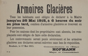 Wandanschlag in französischer Sprache. Veröffentlicht im von Deutschland besetzten Frankreich; Roubaix, 31. März 1915. Verbot der Ausfuhr von Lebensmitteln und Vieh aus der Stadt Roubaix. "Défense de sortir des Vivres et des Bestiaux de Roubaix Je défends de laisser sortir du rayon de la ville de Roubaix toute sorte de vivres et de bestiaux sans une permission spéciale de la Commandanture de l’Etape. Les contrevenants seront punis d’une amende ou d’emprisonnement et les marchandises dont la sortie est interdite seront confisquées sans indemnité. Roubaix, le 31 Mars 1915. Commandanture de l’Etape Hofmann Major et Commandant. N° 78"