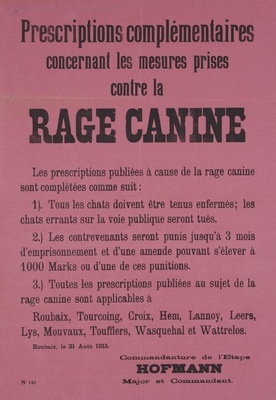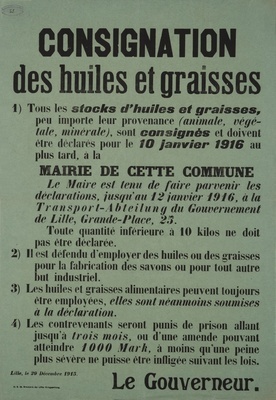 Wandanschlag in französischer Sprache. Veröffentlicht im von Deutschland besetzten Frankreich; Roubaix, 23. August 1915. Alle Korken, ob benutzt oder nicht, müssen beim Wirtschaftsausschuss abgegeben werden. Es werden für das Kilo unbenutzter Korken 1,50 francs und für ein Kilo benutzter Korken 0,50 francs gezahlt. "Remise des Bouchons de liège Tous les bouchons de liège peu importe s’ils ont été employés ou pas, ainsi que tous les déchets de bouchons de liège sont à remettre jusqu’au 1er Septembre 1915 au plus tard au: ’Wirtschafts-Ausschuss Banque de France, Place de la Liberté, à Roubaix Cet ordre ne concerne pas les bouchons de liège se trouvant sur des bouteilles remplies ou encore en usage. Mais pour ces derniers cas on doit faire connaître leur nombre à l’administration désignée ci-dessus, ils sont consignés et doivent être remis également après usage au ’Wirtschafts-Ausschuss’. Le ’Wirtschafts-Ausschuss’ paie: Le kilo de bouchons de liège secs et nouveaux: 1 fr. 50 Le kilo de bouchons de liège secs et usagés: 0 fr. 50 Le kilo de déchets de bouchons de liège: 0 fr. 50 Les contrevenants seront punis jusqu’à 3 mois de prison et d’une amende pouvant s’élever à 1000 Marks ou d’une de ces punitions. De plus les bouchons non déclarés pourront être enlevés sans aucune indemnité. Roubaix, le 23 Août 1915. Commandanture de l’Etape Hofmann Major et Commandant."
