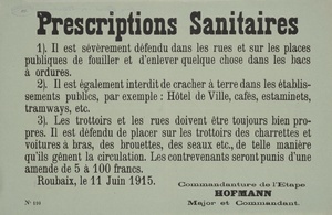 Wandanschlag in französischer Sprache. Veröffentlicht im von Deutschland besetzten Frankreich; Roubaix, 9. Juni 1915. Die Strafe für Roubaix wegen Schüssen auf einen deutschen Wachposten beträgt 100.000 francs. Der interne Objektlink unten verweist auf die Ankündigung der Strafe. "Amende La ville de Roubaix a été punie d’une amende de 100.000 francs parcque le 20 et 24 Avril, on a tiré sur une sentinelle allemande, dans la rue de Lannoy. Roubaix, le 9 Juin 1915. Commandanture de l’Etape Hofmann Major et Commandant."