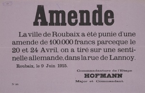 Wandanschlag in französischer Sprache. Veröffentlicht im von Deutschland besetzten Frankreich; Roubaix, 9. März 1915. Es werden einige Arbeiter gesucht, besonders Schmiede, Mechaniker, Schlosser, Schreiner, Zimmerleute und Stellmacher. "On demande des ouvriers La Commandanture de Roubaix cherche un assez grand nombre d’ouvriers spécialement: Forgerons, Mécaniciens, Serruriers, Menuisiers, Charpentiers et Charrons Gain journalier: 5 francs. S’adresser à Tourcoing: Rue de Lille, 60. Roubaix, le 9 Mars 1915. Commandanture de l’Etape. Hofmann Major et Commandant."