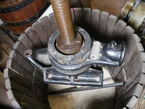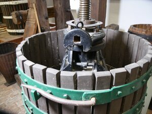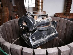 Handbetriebene Eisenspindelkelter aus dem Bürgerhaus in Trier-Ehrang. Um den Saft mit dieser Kelter aus den Früchten (Äpfel, Weintrauben etc.) zu gewinnen, werden diese zuerst in einer (Trauben-)Mühle gemahlen und man gewinnt so die so genannte Maische. Um den Saft aus dieser zu pressen wird die Maische (die kleinen Obst-Stücke einschließlich der Schalen und Kerne) in den Kelterkorb geschüttet. Über die Maische wird eine Lage glatter Dielen gelegt und darauf zwei gehobelte Balken („Hunde“). Der Hohlraum zwischen „Hunden“ und Baum wird mit längs und quer gelegten Bracken gefüllt. Durch Hin- und Herbewegen des (abgängigen) Kelterhebels werden die Dielen nach unten gedrückt und die Maische gepresst. Dies wird durch die eisene Fallkeile - bei dieser Kelter sind es 7 Stück - benutzende Mechanik ermöglicht. Rückwärtsbewegungen des Kelterhebels werden dabei nicht auf die Spindel übertragen. Der Most läuft dann über die unter dem Presskorb befindliche Schale in ein dafür vorgesehenes Behältnis ab. Keltern mit Fallkeilen gibt es seit Ende des 19. Jahrhunderts. Wegen des Geräuschs der fallenden Keile (klipp-klapp-klipp) werden sie auch Klippkeltern genannt. Im Vergleich zu älteren Modellen bietet diese Kelter den Vorteil, dass man zum Pressen nicht immer um die Kelter herumlaufen muß. Außerdem ist im Vergleich zu ihrem hölzernen Vorgänger die eiserne Kelterstange viel leichter.