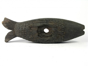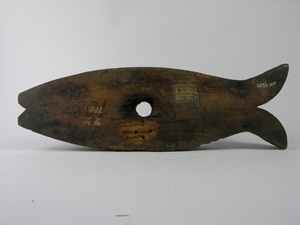 Kräftiger Fisch, nach links gerichtet, mit langem Kopfteil, geöffnetem kleinem Maul und mit großem zweiteiligem Schwanz.