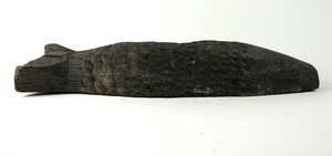 Kräftiger Fisch, nach links gerichtet, mit langem Kopfteil, geöffnetem kleinem Maul und mit großem zweiteiligem Schwanz.