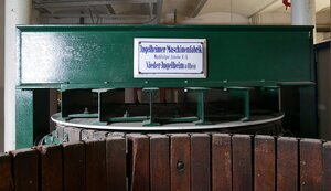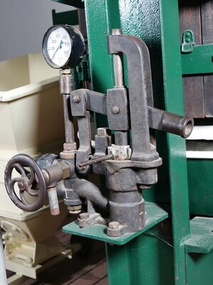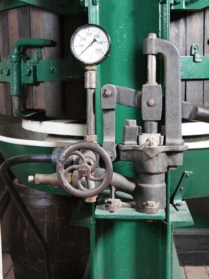 Die ersten hydraulische Keltern entstanden um das Jahr 1900 und hatten das Ziel den Winzer bei der Knochenarbeit des Kelterns zu entlasten. Bei vertikal arbeitenden Spindel-, Schrauben- oder Kniehebelpressen wird mittels Hydraulik eine bewegliche Platte im Korb mit der Maische gegen eine fixe Endplatte gedrückt. Die Unterdruckkelter geht auf eine Erfindung des Winninger Schlossermeisters Ludwig Saas zurück. In der Mitte der Frontseite ist eine handbetriebene Pumpe angebracht. Funktinsweise (siehe auch Abbildungen): Die Wasserzufuhr konnte unten am Wasserhahn angeschlossen werden. Der schwarze Druckschlauch geht links vom Absperrhahn nach unten zum Zylinder unter der Presse. Der Überdruck wird durch die handbetriebene Pumpe rechts vom Absperrhahn erzeugt. Der abgängige Griff zum Pumpen konnte an das Gewinde ganz rechts angeschraubt werden. Und so funktioniert die Kelter: Eine externe Pumpe liefert über eine Leitung Wasser mit Überdruck. Ein unter dem Presskorb angebrachte Kolben drücken den Boden des Presskorbs nach oben. Dadurch wird die Maische ausgepresst und der Saft läuft in die Pfanne. Das Besondere an dieser Kelter ist, dass sie zwei Presskörbe besitzt, die an Schienen in halber Höhe verschoben werden können. So ist immer ein Korb unter der hydraulischen Presse. Der andere Korb hängt an den Schienen vor der Presse und kann dort nach unten entleert und danach vom oben wiederbefüllt werden.