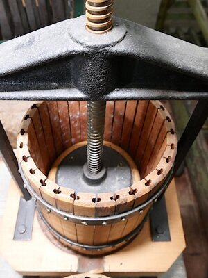 Die kleine Kelter besteht aus einem Biet (Boden der Kelter), einem Gestell aus zwei Metallsäulen und einem darüber liegendem Bügel, der Kurbel und einem Korb für das kleingemahlene Obst aus mit 2 Metallreifen zusammengehaltenen senkrecht angebrachten Holzlatten. Der Presskorb steht in einer Vertiefung auf einer vierekigen hölzernen Platte (dem Biet). Die Kelter besitzt 2 nahezu identische Presskörbe, die im Wechsel genutzt werden können. Die Kelter steht auf 4 gusseisernen Füßchen. Funktionsweise: Um den Saft aus den Früchten (Äpfel, Weintrauben etc.) zu gewinnen, werden diese zuerst in einer (Trauben-)Mühle gemahlen. Danach wird die Maische (die kleinen Obst-Stücke einschließlich der Schalen und Kerne) in den Kelterkorb gefüllt. Dort werden sie durch Anwendung von Druck ausgepresst. Bei dieser Art von Spindelkeltern wird durch Kraftanwendung an zwei üben an der Spindel angebrachten Griffen die Spindel gedreht. Dadurch wird die an der Schraubenspindel befestigte Pressplatte nach unten bewegt und die die Fruchtschnipsel im Kelterkorb zusammenpresst. Als Folge läuft der Fruchtsaft durch die Spalten des Kelterkorbs auf den Biet und durch den Ausguss in ein neben diesem abzustellendem Auffanggefäß. Der Durchmesser des Pressplatte ist etwas kleiner der als der Innendurchmesser des Presskorbs.