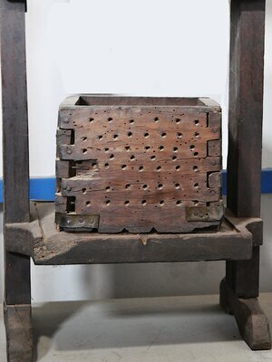 Archaisch wirkende Obstpresse mit einer Holzspindel. Die Kelter ist mehrstöckig. Unten befindet sich auf dem Biet (einer Plattform) der viereckige aus vier durchlöcherten Brettern zusammengesetzte Bietkasten (eine frühere Form des Kelterkorbs) in den die Maische eingefüllt wird. Darüber befindet sich eim Balken durch den die Holzspindel geführt wird. Ganz oben befindet sich ein Brett, das der Stabilisierung der Spindel dient. Funktionsweise von Spindelpressen: Um den Saft aus den Früchten (Äpfel, Weintrauben etc.) zu gewinnen, werden diese zuerst in einer (Trauben-)Mühle gemahlen. Danach wird die Maische (die kleinen Obst-Stücke einschließlich der Schalen und Kerne) in den Kelterkorb gefüllt. Dort werden sie durch Anwendung von Druck ausgepresst. Bei dieser Art von Spindelkeltern wird durch Kraftanwendung an zwei üben an der Spindel angebrachten Griffen die Spindel gedreht. Dadurch wird die an der Schraubenspindel befestigte Pressplatte nach unten bewegt und die die Fruchtschnipsel im Kelterkorb zusammenpresst. Als Folge läuft der Fruchtsaft durch die Spalten des Kelterkorbs auf den Biet und durch den Ausguss in ein neben diesem abzustellendem Auffanggefäß. Der Durchmesser des Pressplatte ist etwas kleiner der als der Innendurchmesser des Presskorbs.