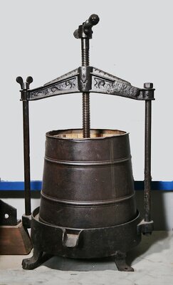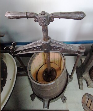 Die kleine Kelter besteht aus einem Gestell aus zwei Metallsäulen und einem darüber liegendem Bügel, der Kurbel und einem Korb für das kleingemahlene Obst aus mit 2 Metallreifen zusammengehaltenen senkrecht angebrachten Holzlatten. Der Presskorb steht in einer Schüssel in der der Most aufgefangen wird. Die Presse birgt 2 Besonderheiten: Einen kunstvoll verzierten Bügel und ein zylindrischer Presskorb in einer konisch nach oben zulaufende ein Fässchen imitierende Blechverkleidung. Funktionsweise einer Spindelpresse: Um den Saft aus den Früchten (Äpfel, Weintrauben etc.) zu gewinnen, werden diese zuerst in einer (Trauben-)Mühle gemahlen. Danach wird die Maische (die kleinen Obst-Stücke einschließlich der Schalen und Kerne) in den Kelterkorb gefüllt. Dort werden sie durch Anwendung von Druck ausgepresst. Bei dieser Art von Spindelkeltern wird durch Kraftanwendung an der Kurbel die Spindel gedreht. Dadurch wird die an der Schraubenspindel befestigte Pressplatte nach unten bewegt und die die Fruchtschnipsel im Kelterkorb werden zusammenpresst. Als Folge läuft der Fruchtsaft durch die Spalten des Kelterkorbs unter der Blechverkleidung hindurch in die darunterliegende Schale und durch den Ausguss in ein Auffanggefäß.