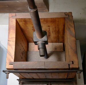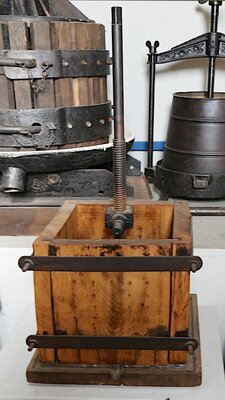 Viereckiger Bietkasten - Fragment einer Obstpresse Der Bietkasten besteht aus vier für den Austritt des Mosts durchlöcherten und miteinander verzahnten Brettern. Auf allen 4 Seiten befinden sich zur Stabilität bei hohem Druck angebrachte Metallbeschläge. Aus der Mitte des Bodens wächst eine Metallspindel mit ihrer Schraubenmutter.
