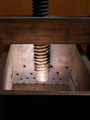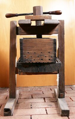 Kleine, einfache auf einem Fuß stehende und der Form nach an einen Stuhl erinnernde Spindelpresse. Mit Ausnahme des Stiels der Kurbel ist sie vollkommen aus Holz gefertigt. Die Pressplatte, die von der Spindel auf die Maische gedrückt wird ist abgängig. Funktionsweise: Um den Saft aus den Früchten (Äpfel, Weintrauben etc.) zu gewinnen, werden diese zuerst in einer (Trauben-)Mühle gemahlen. Danach wird die Maische (die kleinen Obst-Stücke einschließlich der Schalen und Kerne) in den Kelterkorb gefüllt. Dort werden sie durch Anwendung von Druck ausgepresst. Bei dieser Art von Spindelkeltern wird durch Kraftanwendung an der Kurbel die Spindel gedreht. Dadurch wird die an der Schraubenspindel befestigte Pressplatte nach unten bewegt und die Fruchtschnipsel im Kelterkorb werden zusammengepresst. Als Folge läuft der Fruchtsaft durch die Löcher des Bietkastens in die darunterliegende Rinne und durch den Ausguss in ein Auffanggefäß.