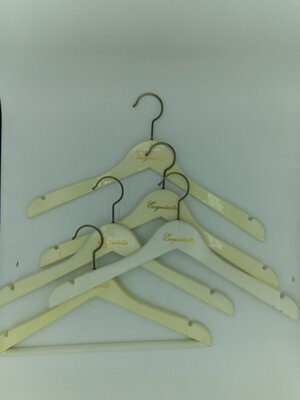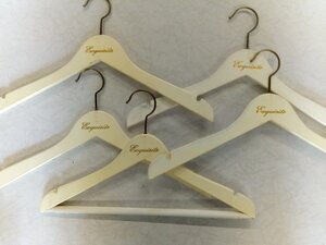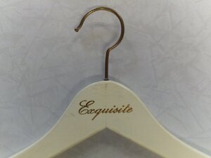 Konvolut von 5 Kleiderbügeln/ Flachbügeln aus Holz mit Rockeinschnitt, einer davon zusätzlich mit Steg aus rutschfestem Kunststoff. Metallhaken um 360 Grad drehbar. Aufdruck in Schreibschrift " Exquisite". Dies ist eine Modemarke der GGV Handelsgesellschaft aus Kaarst in Nordrhein-Westfalen.