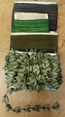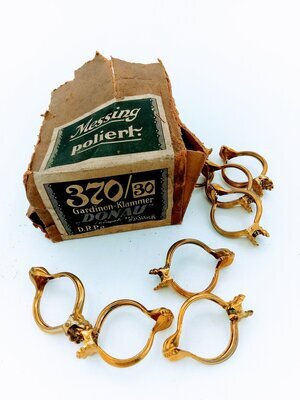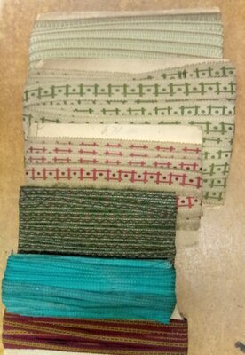 Konvolut von ca. 25 verschiedenen Varianten gewebter Borten für Polsterarbeiten. Meterware in unterschiedlichen Breiten und Mustern (Fransen, Posamente, Spitze, Stickerei....), teilweise in Originalverpackung. Außerdem 4 Pakete Gardinenband (Meterware) mit Messingringen. Werkstatt ausgestellt in der Ladengasse.