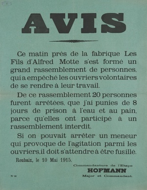 Wandanschlag in französischer Sprache. Veröffentlicht im von Deutschland besetzten Frankreich; Roubaix, 12. Mai 1915. Versammlungen von mehr als 5 Personen sowie der Aufenthalt von Nicht-Mitarbeitern vor Fabriken sind verboten. "Rassemblements Les rassemblements de plus de 5 personnes sont interdits partout et seront dispersés par les armes. Cette défense intéresse particulièrement les environs des fabriques qui travaillent pour l’autorité militaire allemande. Toutes les personnes n’appartenant pas au personnel de la fabrique qui séjourneront devant celle-ci seront arrêtées et punies d’une amende pouvant s’élever à 200 francs ou à 6 mois de prison, si suivant les lois une peine plus sévère n’est pas applicable. Roubaix, le 12 Mai 1915. Commandanture de l’Etape Hofmann Major et Commandant."