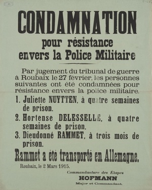 Wandanschlag in französischer Sprache. Veröffentlicht im von Deutschland besetzten Frankreich; Roubaix, 23. März 1915. Zwei Männer werden zu Gefängnisstrafen verurteilt, weil sie die deutschen Besatzungstruppen beleidigt haben. "Condamnations pour conduite incorrecte envers des Allemands 1). Le marchand Cyrille Peers, sera puni d’une semaine de prison au pain et à l’eau parce qu’il a eu une conduite inconvenante envers des Allemands dans un estaminet. 2). Georges Boulanger, sera puni de quatre semaines de prison au régime sévère du pain et de l’eau ayant offensé publiquement des Allemands par des expressions injurieuses. Roubaix, le 23 Mars 1915. Commandanture de l’Etape Hofmann Major et Commandant."