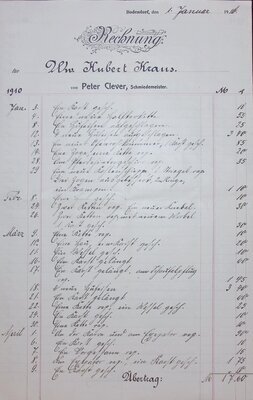 Rechnung vom 1. Januar 1911 von Peter Clever über Schmiedearbeiten mit Auflistung der Arbeitstage pro Monat.