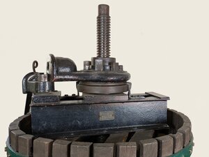 Große Kelter mit Fallkeilen (3) Handbetriebene Eisenspindelkelter. Um den Saft mit dieser Kelter aus den Früchten (Äpfel, Weintrauben etc.) zu gewinnen, werden diese zuerst in einer (Trauben-)Mühle gemahlen und man gewinnt so die so genannte Maische. Um den Saft aus dieser zu pressen wird die Maische (die kleinen Obst-Stücke einschließlich der Schalen und Kerne) in den Kelterkorb geschüttet. Über die Maische wird eine Lage glatter Dielen gelegt und darauf zwei gehobelte Balken („Hunde“). Der Hohlraum zwischen „Hunden“ und Baum wird mit längs und quer gelegten Bracken gefüllt. Durch Hin- und Herbewegen des Kelterhebels werden die Dielen nach unten gedrückt und die Maische gepresst. Dies wird durch die eisene Fallkeile - bei dieser Kelter sind es 8 Stück - benutzende Mechanik ermöglicht. Rückwärtsbewegungen des Kelterhebels werden dabei nicht auf die Spindel übertragen. Der Most läuft dann über die unter dem Presskorb befindliche Schale in ein dafür vorgesehenes Behältnis ab. Keltern mit Fallkeilen gibt es seit Ende des 19. Jahrhunderts. Wegen des Geräuschs der fallenden Keile (klipp-klapp-klipp) werden sie auch Klippkeltern genannt. Im Vergleich zu älteren Modellen bietet diese Kelter den Vorteil, dass man zum Pressen nicht immer um die Kelter herumlaufen muß. Außerdem ist im Vergleich zu ihrem hölzernen Vorgänger die eiserne Kelterstange viel leichter. Der Hersteller C.Salm wurde am 05.01 2010 mii der Mathias Gangolf GmbH & Co.KG Bitburg verschmolzen. Sie ist heute (2025) unter dem Namen Mathias Gangolf GmbH & Co.KG tätig.