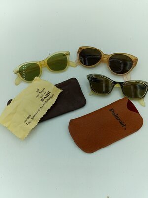 Konvolut von 4 Damensonnenbrillen, Vintage 50/60/70er Jahre. 3x Cat-Eye Form mit beige/ braunen Gläsern, 1x quadratische Retroform mit gelben Gläsern, Marke "Meika". Alle Gestelle aus Acetat bzw. Hornimitat, incl. 1 Etui mit Aufdruck "Polaroit", 1Etui mit Aufdruck " Optik Mahr" Trier.