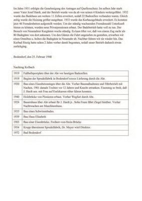 Josef Hardt jr. schrieb, das was sein Vater Josef Hardt sen. ihm in die Feder dikierte, über die Zeit von 1899 bis 1933. Er nennt alle einzelnen Gegebenheiten, aber auch Namen von Gerschäftspartnern, die für die Entwicklung der Geschäftstätigkeiten um den St. Josefs Spruden erfolgte. Lehrer Kolbeck, dem zu verdanken ist dass Hardt diese Eriinerungen niederschrieb, ergänzte die Zeit 1919 bis 1972 und gibt dabei einen Einblick in weitere Details der Dorfgeschichte.