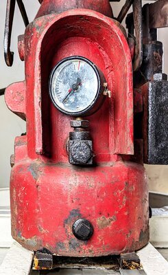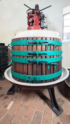 Die ersten hydraulische Keltern entstanden um 1830 und verbreiteten sich ab dem Jahr 1900 mit dem Ziel den Winzer bei der Knochenarbeit des Kelterns zu entlasten. Diese Kelter ist möglicherweise ein Umbau einer handbetriebenen Spindelkelter indem oben auf der Spindel ein Druckwerk Bei dieser vertikal arbeitenden Hydraulik-Spindelpressen wird mittels Hydraulik eine auf der Maische liegende bewegliche Platte im Korb mit der Maische nach unten gegen eine fixe Endplatte aus Metall gedrückt. Wie bei handbetriebenen Keltern läuft der Most durch die Ritzen zwischen den Brettern, wird von einer Schale aufgefangen und verläßt durch den Ausguss die Kelter.