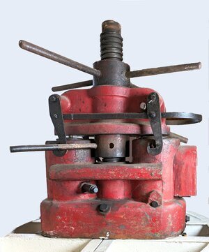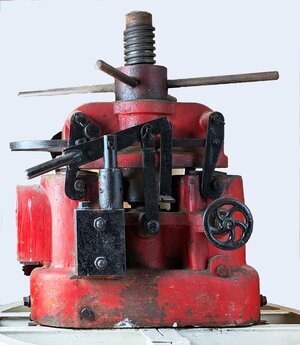 Die ersten hydraulische Keltern entstanden um 1830 und verbreiteten sich ab dem Jahr 1900 mit dem Ziel den Winzer bei der Knochenarbeit des Kelterns zu entlasten. Diese Kelter ist möglicherweise ein Umbau einer handbetriebenen Spindelkelter indem oben auf der Spindel ein Druckwerk Bei dieser vertikal arbeitenden Hydraulik-Spindelpressen wird mittels Hydraulik eine auf der Maische liegende bewegliche Platte im Korb mit der Maische nach unten gegen eine fixe Endplatte aus Metall gedrückt. Wie bei handbetriebenen Keltern läuft der Most durch die Ritzen zwischen den Brettern, wird von einer Schale aufgefangen und verläßt durch den Ausguss die Kelter.