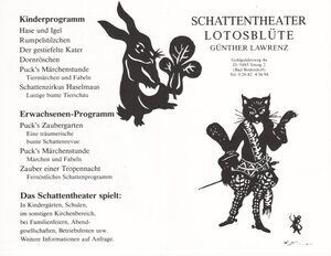 Im DIN A5 Faltblatt mit dem Programm "Schattentheater Lotusblüte" mit einem Programm für Kinder und einem für erwachsene Zuschauer. Das Schattentheater war so konzipiert, dass es in Kindergärten, Schulen in Kinderveranstaltungen, Familienfeiern Abendgesellschaften, Betriebsfeiern und bei sonstigen Veranstaltungen gespielt werden konnte. Günther Lawrenz hat das Programm alleine gespielt.