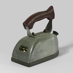 Kleines kompaktes aber schweres Bügelseisen. Vorn befindet sich ein Schraubverschluss, über den das Wasser eingefüllt wird. Hinten ist ein 2 poliger Kabelanschluß. In die Bügelsohle sind zweimal 4 rautenförmig angeordnete Sprühlöcher gebohrt, eine Gruppe vorn und eine Gruppe etwa mittig, angeordnet sind. Der Gandgriff ist mit Typenschild durch 2 Muttern mit dem Gehäuse verbunden.