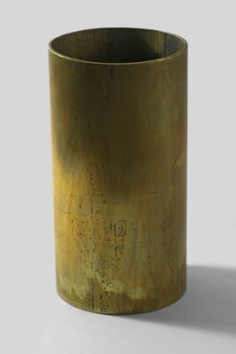 Goldfarbenes matt glänzendes Rohrstück der Bohrlochauskleidung. An der Außenseite sind senkrechte linienförmige Abschürfungen sichtbar. Das Messingrohr war Teil der Bohrlochauskleidung der Quelle von 1913. Zur Vermeidung von Verunreinigungen in der Ahrquelle (Sinziger Mineralbrunnen) musste die Bohrstelle 2007 zurückgebaut und versiegelt werden