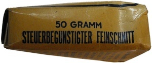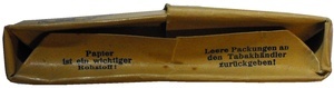 Gelbe Kartonverpackung mit schwarzem Druck. Ohne Steuerbandarole. Die Verpackung ist noch mit Tabak gefüllt.