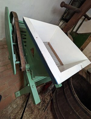 Die Abbeermaschine besteht aus einem Holzgestell mit vier Füßen, einem großen Trichter aus Eisenblech. An dessen Boden befindet sich auf der einen Seite quer eine Walze mit kleinen Zähnen und dieser gegenüber 2 Quader die bei einem Malvorgang hin- und herbewegt werden und damit die Trauben gegen die Walze schieben. Walze und Schiebequader werden über einen hinten aussen aussen an der Abbeermaschine angebrachten Drehstrom-Elektromotor über Transmissionsriemen angetrieben. Die Kraftübertragung erfolgt vom Motor zur Walze auf der einen Seite der Mühle und auf der anderen Seite der Mühle durch einen weiteren Transmissionsriemen von der Walze zu einem Gestänge das die Schieberquader hin- und herbewegt. Die hellgrünblaue Fassung ist nicht die Originalfarben was an Überstreichspuren an den Plaketten mit dem Firmenlogo zu sehen ist. Die ursprüngliche Farbfassung dürfte hellgrau gewesen sein.