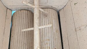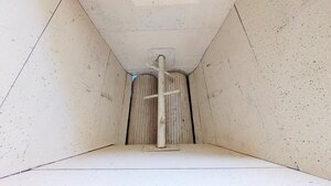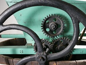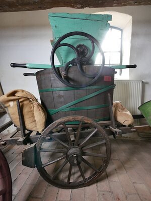Abbeermaschinen mit Traubenpressen dienen dazu Zweige aus dem Lesegut auszusondern damit die nicht den Geschmack des Weins - insbesondere bei einem hohen Pressdruck in der Kelter - negatv beeinflussen. Traubenmühlen, obwohl seit der Antike bekannt, waren über Jahrhunderte umstritten. Noch im 19. Jahrhundert wurde von manchen Autoren das Stampfen mit den Füßen bevorzugt. Die grüne Maschine besitzt auf jeder Seite zwei Tragegriffe, sodass sie von zwei Personen getragen werden kann. Auf diesem befindet sich ein Holztrichter in den die Trauben geschüttet werden. Unten befindet sich ein runder Kamm mit kleine Querbalken befindet, sowie darunter zwei parallele Walzen. Die Walzen aus Metall gefertigt und besitzen Rippen. Kamm und Walzen werden über ein großes Schwungrad aus Metall mit Handgriff und über drei Zahnräder angetrieben. Werden die Weintrauben gemahlen, so fallen Sie nach unten. Im Fall der Installation im Museum fallen die gequetschten Trauben in die darunter befindliche Ablassgölte und sind so das Ausgangsprodukt für die Entsaftung in der Kelter.