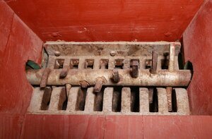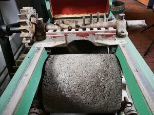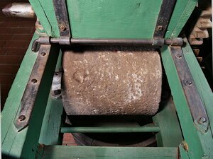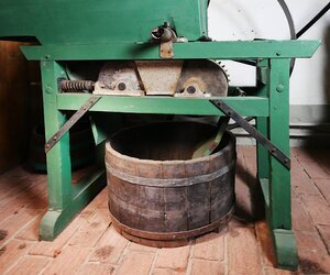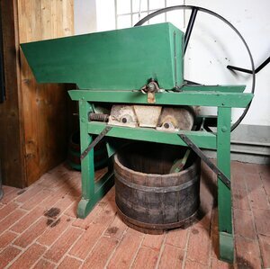 Abbeermaschinen mit Traubenpressen dienen dazu Zweige aus dem Lesegut auszusondern damit die nicht den Geschmack des Weins - insbesondere bei einem hohen Pressdruck in der Kelter - negatv beeinflussen. Traubenmühlen, obwohl seit der Antike bekannt, waren über Jahrhunderte umstritten. Noch im 19. Jahrhundert wurde von manchen Autoren das Stampfen mit den Füßen bevorzugt. Die grüne Maschine steht auf einem Gestell mit 4 Füßen und wurde mit menschlicher Muskerlkraft betrieben. Auf diesem befindet sich ein Holztrichter in den die Trauben geschüttet werden. Unten befindet sich auf einem Rost mit Schlitzen ein runder Kamm mit Zähnen, sowie darunter zwei parallele Steinwalzen. Kamm und Walzen werden über ein großes Schwungrad aus Metall mit Handgriff und über drei Zahnräder angetrieben. Werden die Weintrauben gemahlen, so fallen Sie nach unten. Im Fall der Installation im Museum fallen die gequetschten Trauben in die darunter befindliche Ablassgölte und sind das Ausgangsprodukt für die Entsaftung in der Kelter..