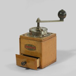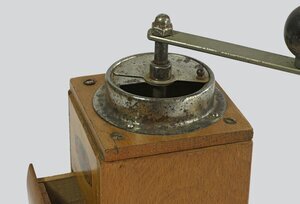 Das Gehäuse besteht aus 8 mm Buchholzplatten. Die Vorder- und rückseitige Holzplatte ist mit den seitlichen Holzplatten verzapft und verleimt. Der Boden mit den Seitenteilen verleimt und vernagelt. Die obere Holzplatte ist verschraubt mit dem Gehäuse, ca. 23 mm dick und trichterförmig ausgefräßt, damit die Kaffeebohnen ins Mahlwerk rutschen können. Das Mahlwerk ist ein unterstelliges Mahlwerk aus geschmiedetem Stahl mit einer nach oben herausragenden Kurbel. Abgeschlossen nach oben ist das Mahlwerk mit einer aufgeschraubten Deckel, in den ein sich seitlich verschiebende Verschluss eingebaut ist. Die Kurbel ist abmontierbar. Vorn unten ist eine kleine herausnehmbare Schublade, die durch eine Blattfederhaltung im Gehäuse festgehalten wird. Die Oben in das Trichtergehäuse eingefüllten Kaffeebohnen werden im Mahlgehäuse je nach Mahlgradeinstellung des Mahlwerks fein gemahlen und fällt in die kleine Schublade (Dosierer).