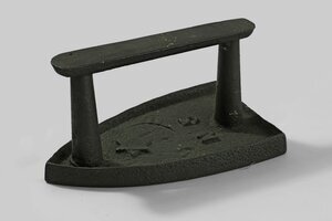 Das leichte Flachbügeleisen gehört zu den massiven Volleisen, die aus Eisen oder Stahl geschmiedet oder gegossen und bereits ab dem 18. Jh. hergestellt wurden. Aufgrund seines geringen Gewichts und seiner flachen Sohle, die nahezu mühelos über die vorher mit Wasser besprengte Wäsche gleitet, erfreute es sich noch weit bis ins 20. Jahrhundert hinein großer Beliebtheit. Das Erhitzen auf dem Kohleofen oder in einer offenen Feuerstelle wie dem Kaminfeuer erforderte jedoch verschiedene Vorsichtsmaßnahmen, um die Bügelwäsche nicht zu beschmutzen oder sich am fest verbundenen Metallgriff zu verbrennen. Viele Büglerinnen wischten daher nach dem Erhitzen des Eisens mit einem Tuch, das sie an ihrer Schürze befestigt hatten, über die Bügelsohle. Als Hitzeschutz wurde oftmals ein dicker Handschuh oder ein Lappen, der um den Griff gewickelt wurde, verwendet. Trotz seiner Zweckmäßigkeit weisen viele Flacheisen eine Verzierung der Deckplatte auf, die heute eine Herkunftsbestimmung erlaubt. In Frankreich wurden häufig Herzen, Früchte, Blumen und Wappen auf der Oberseite des Bügeleisens bevorzugt. In England zierten oftmals Sterne und Kronen die Deckplatte. Die deutschen und skandinavischen Eisen wurden hingegen vielfach schmucklos gestaltet oder mit einer Firmenmarke und den Initialen des Herstellers versehen. Neben diesen Verzierungselementen geben die Formen der Eisen und Griffe weitere Anhaltspunkte. Das vorliegende Flacheisen besitzt einen angegossenen Vollgriff und zeichnet sich durch seine breite, fast dreieckige Bügelsohle aus. Auf der Deckplatte ist ein Stern und die Größenbezeichnung "N 5" eingegossen.