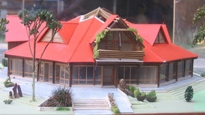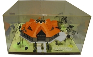 Das Modell im Maßstab 1 : 100 zeigt ein quatratisches Gebäude mit großzügiger Raumaufteilung. ln dem Komplex, der durch eine zentrale Eingangshalle für das gesamte Badgelände erschlossen wird, sollen sich rund um die durch eine Glaskuppel erhellte Trinkhalle Räume für ein Cafe- Restaurant, Kosmetikstudio, eine Arztpraxis, das Verkehrsamt, Therapieabteilung, Sauna, Sport- und Fitnessbereich (geleitet von Olympiasiegerin Heide Rosendahl) befinden. Das Schwimmbecken des Freibades sollte über einen Schwimmkanal mit dem Gebäude verbunden werden. Durch den Einstieg in den Kanal über eine Wärmehalle, sollte auch im Winter das Baden möglich werden und so ein ganzjähriger Kurbetrieb gewährleistet sein.