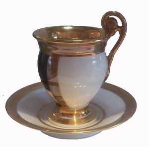 Dünnes Porzellan in der Grundfarbe Weiß. Das Dekor ist in die Glasur gemalt und eingebrannt. Unterteller: Außen breiter Goldrand; Vor der Vertiefung für die Tasse ein ca. 2 mm breiter Kreis in Goldfarben. Im Zentrum des Tassenbodens mit Gold die Jahreszahl 1830. geschrieben. Tasse: Grundfarbe Weiß. Am Fuß ein Ring ca. 8 mm Breit in Gold gemalt. Danach ca. 2 mm Grundfarbe weiß. Anschließend bis Tassenfüllboden wieder goldfarbener Ring. Auf der Vorderseite eine Person gemalt in bunten Farben auf fast schwarzem Hintergrund. Links und Rechts ist das Bild mit einem ca. 1 cm breiten goldenen Balken eingefasst. Nach oben schließt das Bild ein umlaufender ca. 1,5 cm breiter goldgemalter Ring ab. Die Rückseite der Tasse ist in der Grundfarbe (nicht bemalt) und der Griff ist goldfarben bemalt.