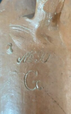Die braun glasierte handgeformte Steinzeugflasche hat eine zylindrische Form. Über die runde Schulter geht sie in den mit Rillen versehenen Hals über, unterhalb ist rercht grob ein kleiner Henkel angesetzt. Nicht nur der Henkel ist grob gearbeitet, auch die Flasche selbst zeigt deutliche Herstellungsspuren und eine ungleichmäßige Glasur.