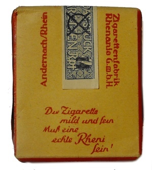 Helle Papierpackung mit rotem Negativdruck auf Vorderseite und Seiten, Rückseite roter Druck auf Papierpackung. Steuerbandarolen ungeöffnet. Verpackung: Deckel - 20 Rheni Zigaretten; Seiten - 20 Rheni Zigaretten; Boden 20 Rheni; Rückseite - Zigarettenfabrik Rhenania G.m.b.H. Andernach/Rhein und Werbeschrift "Die Zigarette mild und fein Muß eine Rheni sein´"; Steuerbanderole - 20 Zigaretten, Das Stück 4 Rpf (Reichspfennig), Prägung mit Reichadler und Hakenkreuz und der Zahl 8. Hergestellt wurden sie in den letzten Kriegsmonaten von 1944/1945. Nach dem 2. Weltkrieg waren sie auf dem Schwarzmarkt ein beliebtes Tauschobjekt und wurden gegen Lebensmittel eingetauscht.