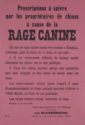 Wandanschlag in französischer Sprache. Veröffentlicht im von Deutschland besetzten Frankreich; Roubaix, 15. Juli 1915. Pferde dürfen nur innerhalt des Gebietes der Etappenkommandantur Roubaix verkauft, gekauft oder getauscht werden. Die Transaktionen müssen im jeweils zuständigen Rathaus gemeldet werden. "Restriction concernant la vente des Chevaux 1). La vente des chevaux appartenant aux civils n’est autorisée qu’à l’intérieur du territoire de la Commandanture de l’Etape de Roubaix, c’est-à-dire que le nouveau propriétaire doit demeurer sur le territoire de l’Etape afin que le cheval ne puisse pas sortir du rayon de la Commandanture de l’Etape de Roubaix. 2). Si par suite de vente, d’échange, etc., les chevaux changent de propriétaire, le vendeur aisni que l’acheteur doivent déclarer la vente, l’achat ou l’échange à la Mairie de leur Commune. 3). Les Mairies doivent faire connaître à la Commandanture de l’Etape de Roubaix immédiatement tous les changements de propriètaires de chevaux. 4). Les contrevenants, c’est-à-dire les acheteurs, vendeurs ou Maires seront punis jusqu’à 1000 francs d’amende ou jusqu’à 3 mois d’emprisonnement. Roubaix, le 15 Juillet 1915. Commandanture de l’Etape Hofmann Major et Commandant."