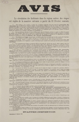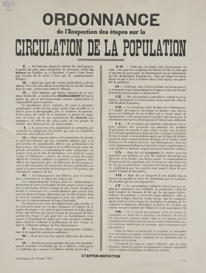 Wandanschlag in deutscher und französischer Sprache. Veröffentlicht im von Deutschland besetzten Frankreich; Valenciennes, 11. Februar 1915. "Bekanntmachung Oestlich der masurischen Seen gaben die Russen ihre Stellungen auf. Die Kämpfe dauern fort. Bisher wurden 26 000 Gefangene gemacht: 20 Geschütze, 30 Maschinengewehre erobert, viel Kriegsmaterial erbeutet. In Polen rechts der Weichsel wurde unsererseits die Offensive fortgesetzt. Die Stadt Sierzpo wurde genommen. Etappen-Inspektion Valenciennes, 11. Februar 1915"
