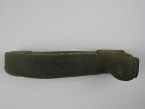 Fassriegel vollrund geschnitzt. Ein nach rechts ausgerichtetes, an Kopf und Brust mit langen Haaren bewachsenes Tier, wohl Hund. Fehlstellen an Vorder- und Hinterlauf.