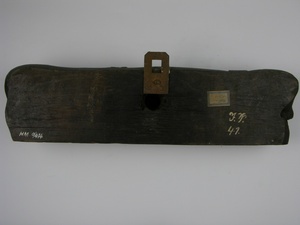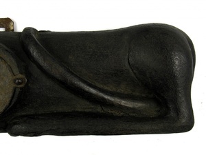 Hochrelief. Nach links liegender Hund mit einem breiten, glatten Halsband. Das Maul geöffnet, die Zunge heraushängend, den Schwanz zwischen den Beinen hindurch über den Körper gelegt. Mittelscheibe mit glattem Eisenring.