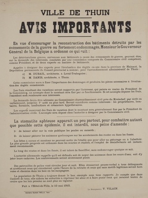 Wandanschlag in französischer Sprache. Veröffentlicht im von Deutschland besetzten Belgien; Thuin, ohne Datum. Das Belgische Auskunftbüro für die Kriegsgefangenen und Internierten informiert, dass pro Monat ein Versorgungspaket à 2, 5 oder 10 francs an einen Gefangenen in Deutschland geschickt werden kann. "Agence Belge de Renseignements pour les prisonniers de guerre et les internés Oeuvre Belge de Secours aux Prisonniers de guerre internés en Allemagne ’La Cantine du Soldat prisonnier.’ Envois de Victuailles dasn les camps de prisonniers en Allemagne moyennant deux, cinq ou dix francs par boîte (port compris). [Es folgen Listen der unterschiedlichen möglichen Inhalte der Kisten für 2, 5 oder 10 francs.] Sie quelques produits étaient épuisés, ils seraient remplacés par d’autres d’une valeur équivalente. Des expéditions seront effectuées tous les deux jours et seront dans la huitaine à destination. L’arrivée est certaine. L’on peut indiquer sur chaque bon l’adresse d’un prisonnier et celle de l’expéditeur. L’adresse du prisonnier doit être bien complète. Il n’est permis d’envoyer qu’un seul colis par mois pour un même prisonnier. Le bureau pour le canton de Thuin est établi à Thuin, Grand’Rue, n° 50. Ceux qui désirent faire un evoi à un prisonnier de Guerre peuvent y faire leur versement tous les jours non fériés, de 2 à 4 heures de l’après-midi. Le Délégué pour le Hainaut, René Greiner. Les Déléguées pour le Bureau correspondant du Canton de Thuin, Juliette Vilain, Eudoxie Liégeois."
