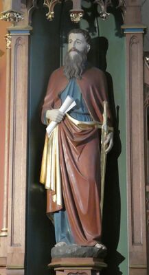 Gewandfigur des Apostel Paulus. In den Händen hält er seine beiden ikonographischen Merkmale eine Schriftrolle und ein Schwert. Der Apostel Paulus steht auf einer unregelmäßig geformten, runden, leicht gewölbten Basis mit rauer Oberfläche, die die Erde symbolisieren soll. Er trägt einen langen, welligen bis fast auf die Brust reichenden Vollbart der in sechs Locken endet. Seine kurzen, welligen Kopfhaare sind nach „römischer“ Art nach vorne zur Stirn hin gekämmt. Gekleidet ist er in eine bodenlange Tunika, die in der Taille gegürtet ist. Über der Tunika trägt er einen Mantel, der nur oben unterhalb des Halses geschlossen ist, jedoch vorne den Blick auf das Untergewand frei lässt. Der Mantel bedeckt beide Schultern. Mit der rechten Hand rafft er die linke untere Hälfte des Mantels nach rechts oben zur Taille hin, so dass sein Körper nun unterhalb des Gürtels bedeckt ist. In der rechten Hand hält er auf der Höhe der Hüfte eine Schriftrolle. Die linke Hand berührt ein Langschwert an seiner linken Seite. Das Schwert, dessen Heft abgebrochen ist, reicht bis zur Erde. Paulus Blick ist leicht nach rechts oben gerichtet. Die in Holz gearbeitete und bunt gefasste Skulptur befindet sich in der Kirche St. Mariä Himmelfahrt in Otterstadt auf dem rechten Seitenaltar.