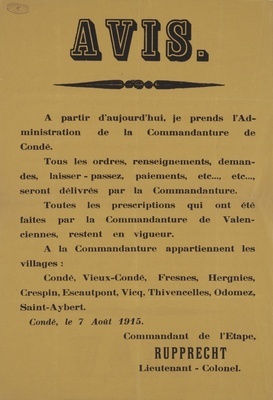 Wandanschlag in französischer Sprache. Veröffentlicht im von Deutschland besetzten Frankreich; Condé, 12. August 1915. Der Preis für Vieh wird auf 1,25 francs pro Kilogramm festgelegt. "Commandanture d’Etapes. Avis. Par ordre de l’Inspection d’Etapes le prix maximum du bétail est fixé à frs 1,25 le kilo pour de la bête sur pied. Condé, 12 Août 1915. Rupprecht Lieutenant-Colonel."