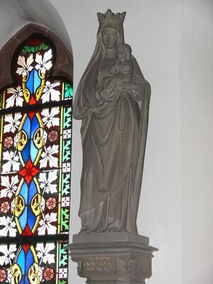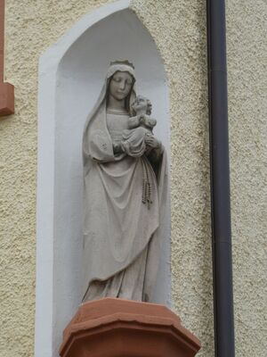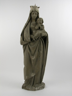 Dargestellt ist Maria mit Kind. Sie steht auf einer unregelmäßig geformten, flachen Basis. Sie trägt ein bodenlanges, oben eng anliegendes und ab der Taille in weite Falten fallendes Gewand. Darüber trägt sie einen bodenlangen, weiten Umhang. Mit dem rechten Arm rafft sie ihn vorne etwas nach oben. Ein Band mit einem daran hängenden Kreuz liegt um die Taille. Ein Schleier bedeckt vollständig ihr Haupt und auch die Schultern. Über dem Schleier trägt sie eine Burgenkrone mit an Zinnen erinnernde Zacken. Auf der vorderen, breiteren Zinne befindet sich eine Spitze, auf der möglicherweise ein Stern befestigt war. Ihr Blick ist auf das Kind gerichtet, das sie auf der Höhe ihrer Brust hält. Es sitzt auf ihrem rechten Arm bzw. auf ihrer rechten Hand. Mit der linken Hand sichert sie es am Oberschenkel ab. Das Jesuskind ist in eine Tunika gekleidete. Seine Haare sind kurz und lockig. Es hat die Hände zum Gebet mit den Handflächen aneinander gelegt. Die Skulptur ist innen hohl. Das Gipsmodell befindet sich in Stein umgesetzt, jedoch nicht mit Mauerkrone gekrönt, sondern mit einer mit Lilien besetzten Krone in der Taufkapelle St. Nikolaus in Bellheim, sowie außen am Schulgebäude des Klosters St. Magdalena in Speyer.