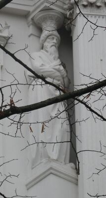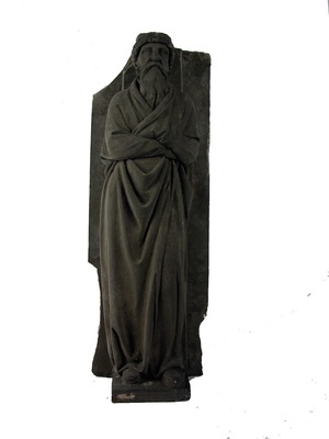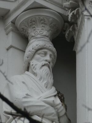 Eine allegorische Darstellung des Winters in der Gestalt eines bärtigen, alten Mannes. Er steht auf einem Sims, das aus einer rechteckigen Gipsplatte herausgearbeitet ist. Die Gestalt trägt einen langen Vollbart und ist gekleidet in ein bodenlanges, faltenreichen Mantel mit Schalkragen. Seine Arme sind über dem Oberkörper verschränkt und fest an den Körper gepresst, als wolle sich die Gestalt so vor der Kälte schützen. Die weiten und überlangen Ärmel des Mantels verhüllen die Hände. Der Kopf ist vor der Kälte geschützt durch eine Kopfbedeckung mit Pelzbesatz. Die Kopfbedeckung ist oben abgeflacht. Auf ihr ruht ein Säulenstumpf mit anschließendem Kapitell, das die Last des Gebäudes aufnimmt, das der Atlant zu tragen hat. Die Stiefel ragen etwas unter dem Gewand hervor. Die bildhauerische Umsetzung des Hochreliefs in Stein befindet sich am Wohnhaus in der Liebigstr. 12 in Frankfurt (Architekt F.J. Schmitt).