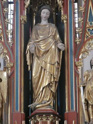 Dargestellt ist Maria als junge Frau, die auf einer abgeflachten Erdkugel (Symbol: Maria als Siegerin über die gesamte Welt), der Mondsichel (apokalyptisches Zeichen) und mit dem linken Fuß auf einer Schlange (Symbol: Sieg über das Übel in der Welt) steht. Ihr Kopf ist in demütiger Haltung zur linken Seite nach unten geneigt. Ihre Augen sind geschlossen. Ihr Haar ist in der Mitte gescheitelt. Die beiden Haarlocken werden von der Stirn zum Hinterkopf hin dicker und sind dort zu drei Haarsträngen gebunden, die bis zur Hüfte reichen. Der mittlere Strang ist zopfartig gebunden. Die Haare der beiden anderen Stränge sind lose und gewellt. Maria ist in eine bodenlange Tunika und einen Überwurf gekleidet, der von ihren angewinkelten Armen nach oben angehoben wird. Die Tunika und der Überwurf zeichnen sich durch einen üppigen Faltenwurf aus. Die Umsetzung des Modells in Holz, vorwiegend in Gold gefasst, befindet sich am Hauptaltar der Kirche St. Marien in Neustadt an der Weinstraße.